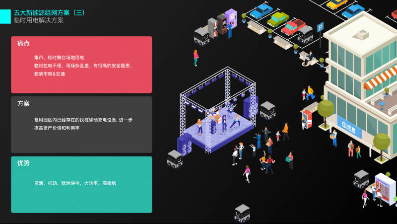 提升園區用電經濟性;用電區域前期規劃不足;集市/臨時舞臺場地用電;老舊小區無多余電容;充電需求潮汐現象嚴重/固定充電樁投入大等問題提供便利優質高效的解決方案